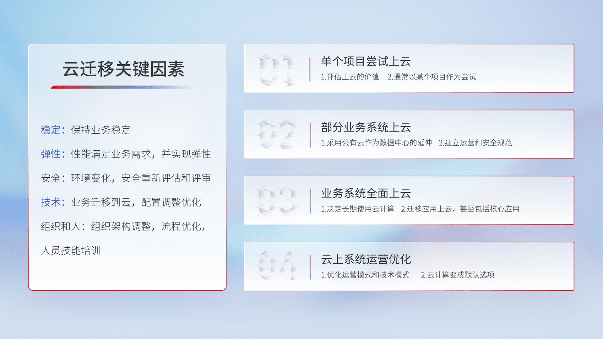 结合实际业务,,,从规划设计、、、、云平台选型、、、云原生改造、、数据迁移、、集成交付,,迁移全过程为客户识别最佳上云路径,,做好风险识别管理,,,设计网络架构、、身份权限、、、安全审计合规、、操作审计、、日志审计、、监控告警策略、、多站点容灾设计等,,,,对云上基础设施进行整体规划,,,,提升IT治理水平,,,,以满足弹性、、、高可用、、高性能的需求。。。