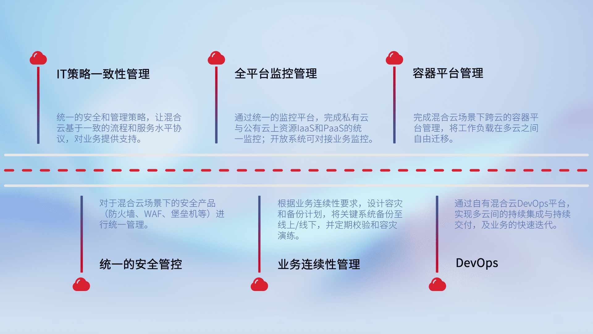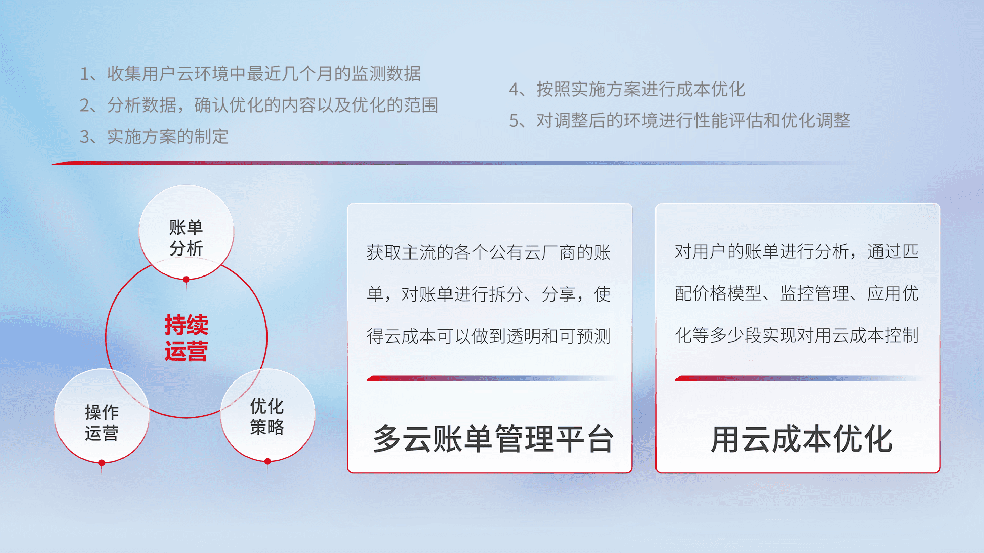通过多云纳管,,,以统一的资源数据模型把客户的云资源进行抽象和封装,,,,进而实现对多云资源的统一操作,,,,保障云资源管理的可靠性、、、、稳定性与可用性。。量身定制化运维内容,,,,配置、、、开发运维、、、补丁管理、、备份、、监控、、、、认证和访问管理、、审计和日常巡检等,,,,保障在用云过程中的可靠度,,,,稳定度以及高可用率。。。