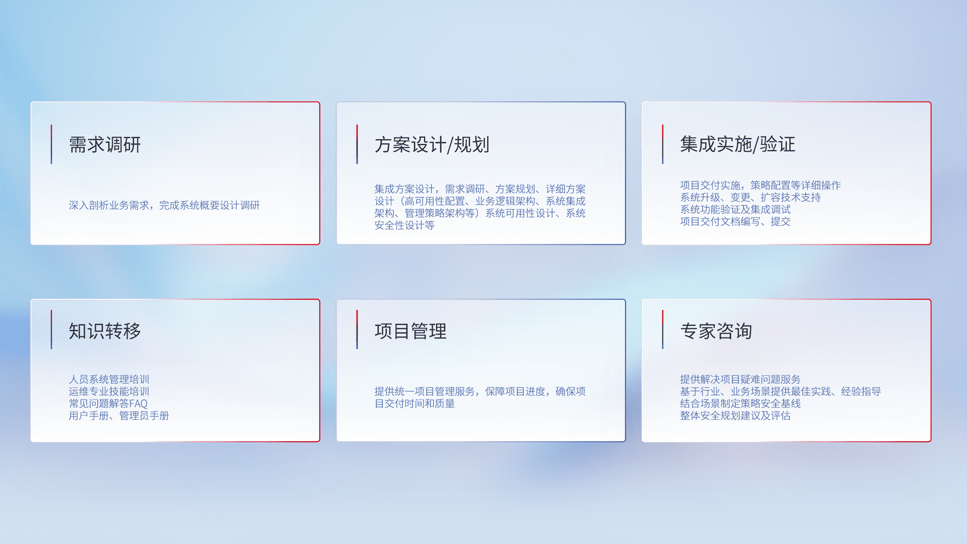 针对客户行业特性,,,,将宏观的安全战略和需求,,,,通过专业的交付服务,,,,实现项目落地,,,,为客户提供标准规范的集成交付服务。。。。