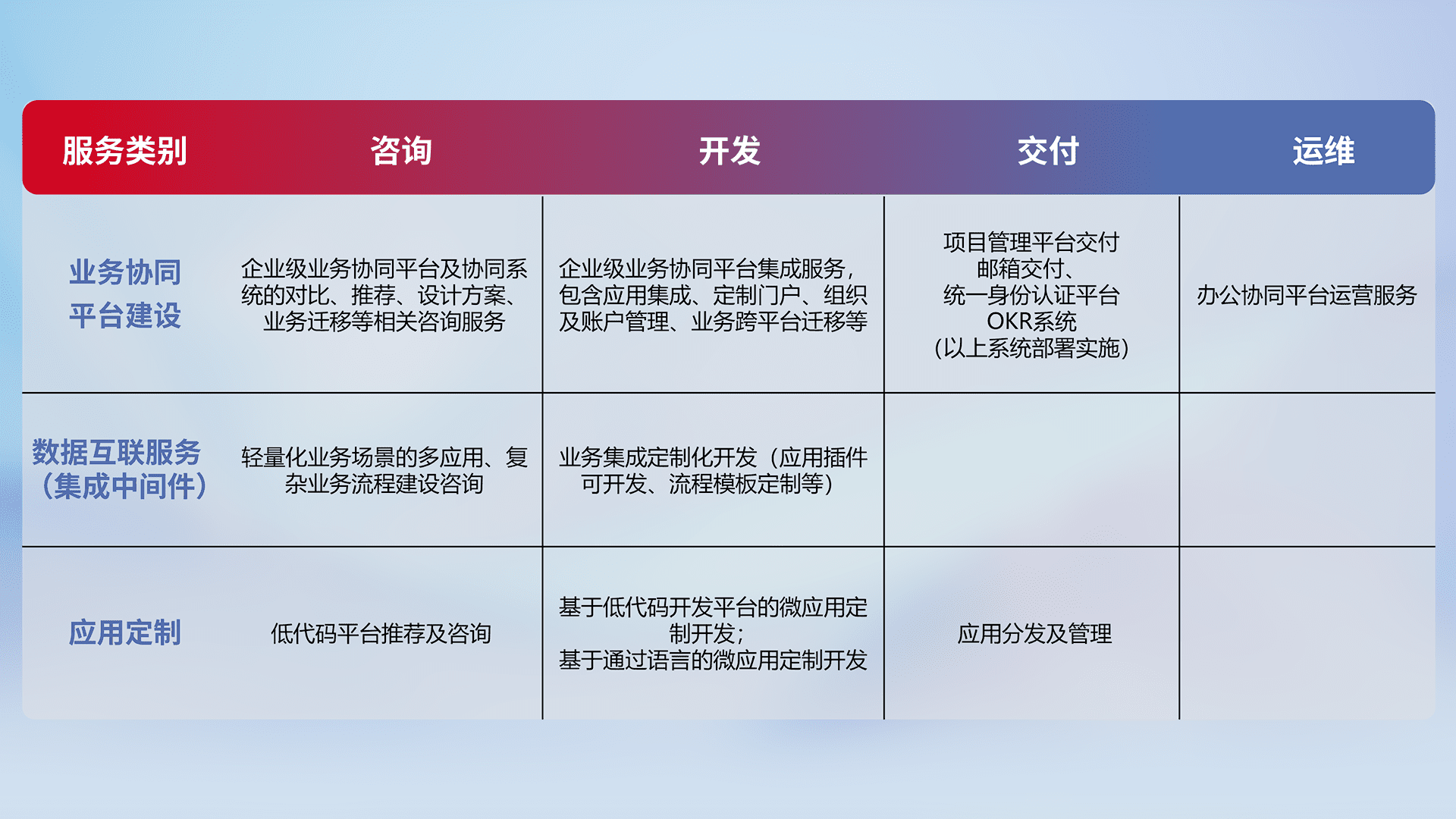 针对钉钉、、企微、、、、IDaas等平台级产品提供产品的规划、、、方案、、、交付、、定制化开发等服务,,,,实现如统一协同办公、、、智能客户服务、、混合会议管理、、、智能数据查询、、、等业务场景,,实现数字化转型。。。。